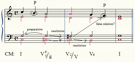 - The following example presents some aspects of resolution, of preparation and the avoidance of false relation. In V65/ii, the preparation and the resolution of the note G (the seventh of the chord) are well written. However, the resolution of C# must go to C natural in order to avoid a false relation. This non resolution is quite normal and good. Let us remember that to avoid a false relation, a note that becomes altered in the previous chord or the chord that follows has to remain in the same voice.