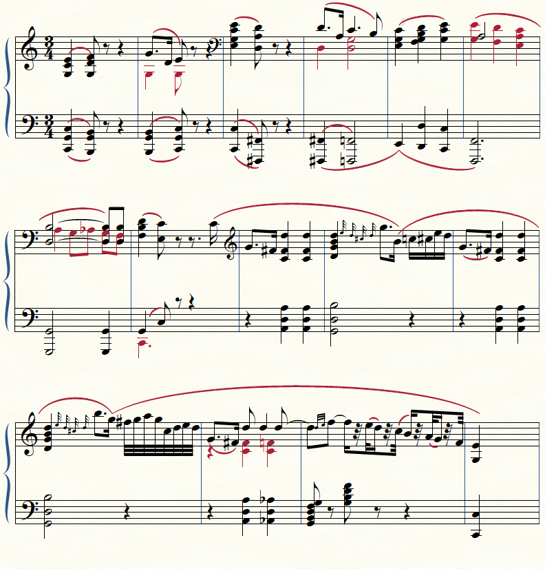 Finally, the note F in V6 is far enough from the F# that precedes it (two beats) and does not create a false relation.