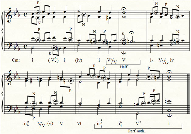 - As much as possible, have a cumulative movement in eighth notes throughout the harmonization except in the last chord of the cadence where the movement must slow down. A repeated note in eighth notes on the same beat does not count to create the movement.